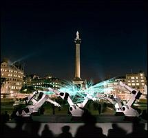 Σε ένα από τα πιο κεντρικά αξιοθέατα του Λονδίνου, την πλατεία Trafalgar, επέλεξαν οι υπεύθυνοι του Φεστιβάλ να τοποθετήσουν το πιο εντυπωσιακό «έκθεμα». Ένα μηχανικό «χταπόδι», αποτελούμενο από οκτώ γιγάντια ρομπότ «έκοβε βόλτες» στον αέρα πάνω από την πλατεία, αφήνοντας «ιπτάμενα» μηνύματα με laser.