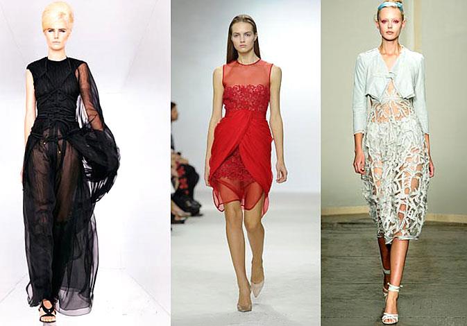 Διαφάνεια Μία ακόμα πιο ισχυρή τάση θα είναι οι διαφάνειες, τις οποίες θα δούμε κυρίως σε φορέματα ή πανωφόρια (π.χ. φαρδιές πουκαμίσες), αλλά και σε αξεσουάρ, όπως ψηλοτάκουνα πέδιλα με διαφανή «πιασίματα» γύρω από το πόδι. Ωστόσο, το στοιχείο που θα επικρατήσει σε συνδυασμό με την διαφάνεια θα είναι το μαύρο: Όσο άτοπο κι αν ακούγεται, το μαύρο είναι μάλλον το χρώμα της Άνοιξης, φορεμένο όμως σε πολύ λεπτά, αέρινα υφάσματα ή απλά σε πολύ λίγα τετραγωνικά εκατοστά –π.χ. φορέματα που αφήνουν πολύ δέρμα ακάλυπτο.