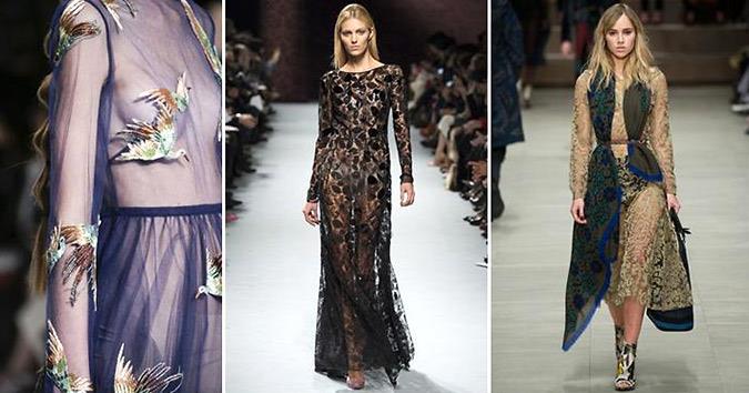 Από αριστερά: Valentino, Nina Ricci, Burberry Prorsum Οι διαφάνειες που αγαπήσαμε το περασμένο καλοκαίρι κυριάρχησαν και στις φθινοπωρινές πασαρέλες. Αυτή τη φορά, όμως, στολίζονται με λεπτομέρειες όπως τα πουλιά του Valentino ή τα μπροκάρ σχέδια του οίκου Burberry που βλέπετε στη φωτογραφία.