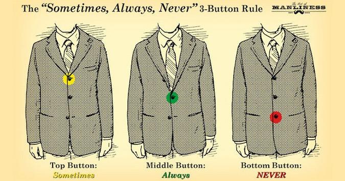 * Πόσα κουμπιά έχει το σακάκι σας; Δύο, τρία, ένα ή μήπως τέσσερα; Προτιμήστε τα τρίκουμπα και τα δίκουμπα σακάκια για τις πιο επίσημες περιστάσεις, έχοντας στο μυαλό σας ότι τα άλλα είναι περισσότερο σπορτίφ. Σε κάθε περίπτωση, μην κουμπώνετε το τελευταίο κουμπί του σακακιού.