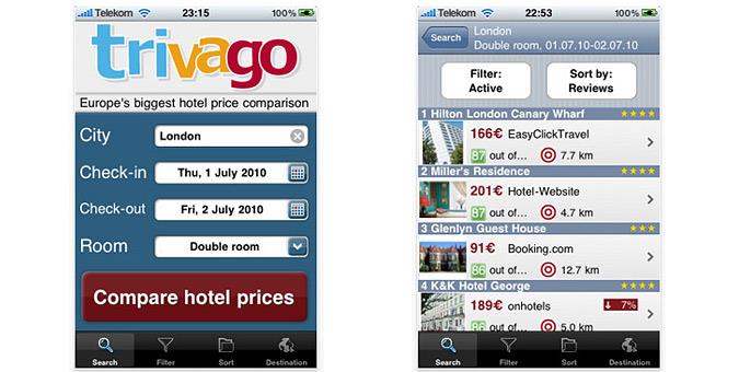 Ψάχνετε το φθηνότερο ξενοδοχείο γύρω σας; Με την εφαρμογή του Trivago μπορείτε να βρείτε ανά πάσα στιγμή στον χάρτη όλα τα ξενοδοχεία που βρίσκονται κοντά σας, καθώς και τις τιμές όλων των online ταξιδιωτικών γραφείων και ξενοδοχειακών αλυσίδων για να επιλέξετε την φθηνότερη. Έχει και μια «μαγκιά»: σε αντίθεση με τις άλλες αντίστοιχες εφαρμογές σύγκρισης ξενοδοχείων, όπως το εξαιρετικό Booking, το lastminute.com και το Hotels.com, το Trivago συγκρίνει τις τιμές που δίνουν όλα τα παραπάνω για το δωμάτιο που θα επιλέξετε και δίνει την πιο οικονομική.