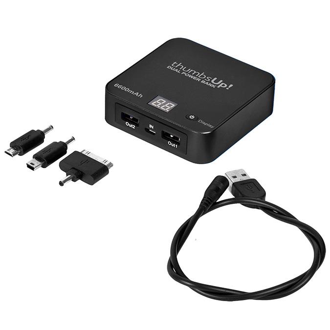 Thumbs Up Dual Power Bank Το Thumbs Up Dual Power Bank είναι ένα μια εξαιρετική λύση για να φορτίζετε τις φορητές συσκευές σας. Διαθέτει χωρητικότητα 6600 mAh, αρκετή για να φορτίσετε πλήρως το smartphone σας 3 φορές, ενώ παράλληλα μπορεί να προσφέρει “ενέργεια” σε tablets, mp3 players, eBook readers και πολλές ακόμα φορητές συσκευές. Το Thumbs Up Dual Power Bank είναι συμβατό με όλες τις συσκευές που φορτίζουν μέσω USB, ενώ μπορεί να φορτίσει ακόμα και 2 συσκευές ταυτόχρονα! Τιμή: €55