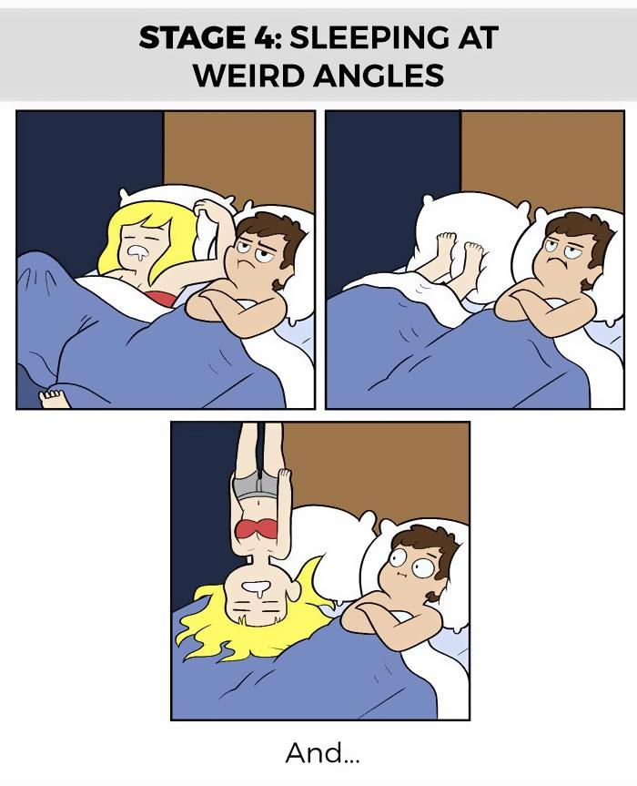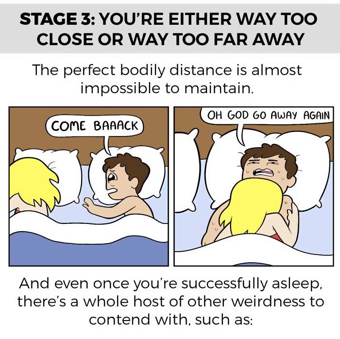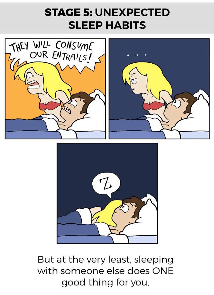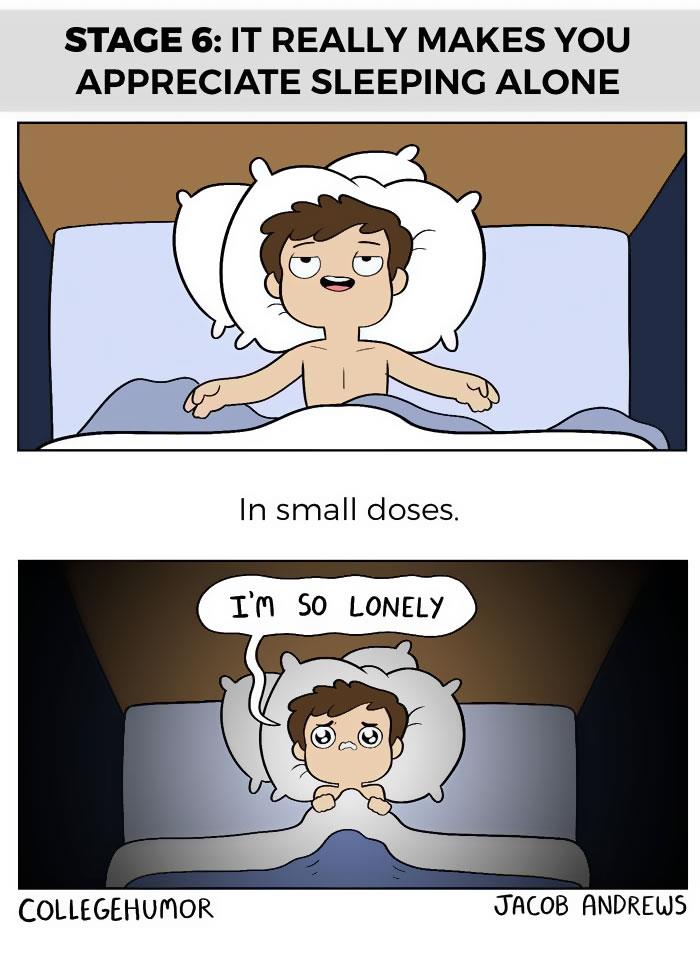 Στάδιο 6ο: Τουλάχιστον, όμως, το να κοιμάσαι με κάποιον άλλο κάνει κάτι καλό: Σε κάνει να εκτιμάς ξανά το να κοιμάσαι μόνος σου. Για λίγο.