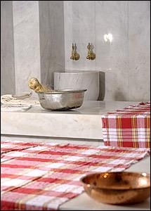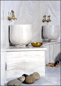 Αγαπημένη λεπτομέρεια, τα μυρωδάτα σαπουνάκια με βάση το ελαιόλαδο σε σχήμα καρδιάς, που σας δίνονται μαζί με ένα σκληρό σφουγγάρι και ένα μπακιρένιο μπολάκι για το μπάνιο σας, όποιο από τα δύο πακέτα και αν επιλέξετε. Οι μαρμάρινες γούρνες όπου ρυθμίζετε οι ίδιοι την θερμοκρασία του νερού αποδεικνύονται σωτήριες –ως έξτρα πηγή πολύτιμου οξυγόνου– για όσους δυσκολεύονται να ανασάνουν στις υψηλές θερμοκρασίες του χαμάμ.