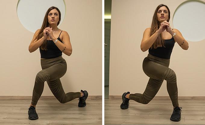 Στεκόμαστε όρθιοι με τα πόδια στο άνοιγμα της λεκάνης και κάνουμε ένα βήμα μπρος με το ένα πόδι, κατεβαίνοντας μέχρι και τα δυο γόνατα να σχηματίσουν γωνίες 90 μοιρών.