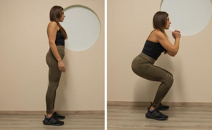 Ανοίγουμε τα πόδια στο άνοιγμα των ώμων και χαμηλώνουμε την λεκάνη προς τα πίσω χωρίς να καμπουριάζουμε. Ανοιχτός θώρακας, ενώ προσέχουμε τα γόνατά να μην ξεπερνάνε τα πέλματα.