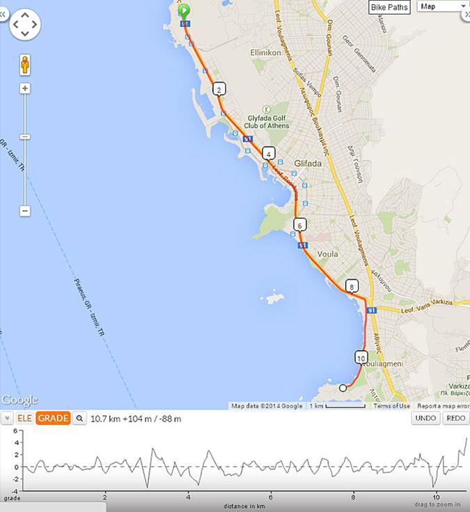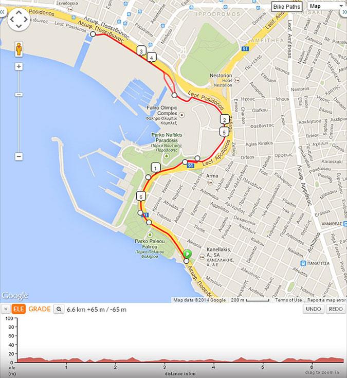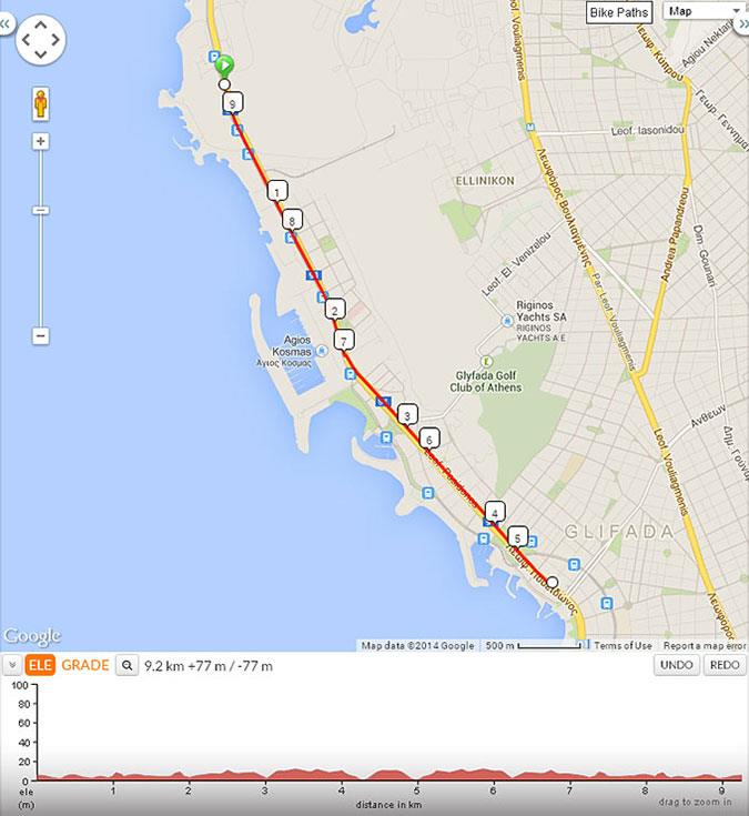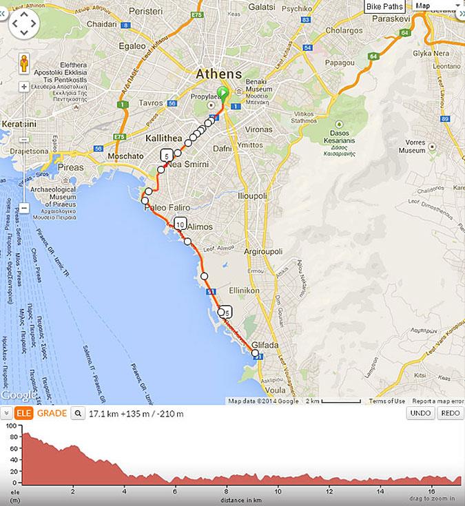 Στήλες Ολυμπίου Διός – Γλυφάδα ~17 χιλιόμετρα – Εύκολη Μια αρκετά εύκολη διαδρομή από το κέντρο της Αθήνας μέχρι τη Γλυφάδα μέσω της Συγγρού και της παραλιακής, χωρίς δυσκολίες και ανηφόρες, με όλη τη απόσταση να είναι σχεδόν κατηφορική. Σε μερικά σημεία όπως για παράδειγμα η Συγγρού και η Ποσειδώνος χρειάζεται να προσέχετε τα αυτοκίνητα. Καλό θα ήταν να την κάνετε μερικές φορές με ποδήλατο για να την μάθετε και μετά να δοκιμάσετε να την τρέξετε. Δείτε την διαδρομή εδώ.
