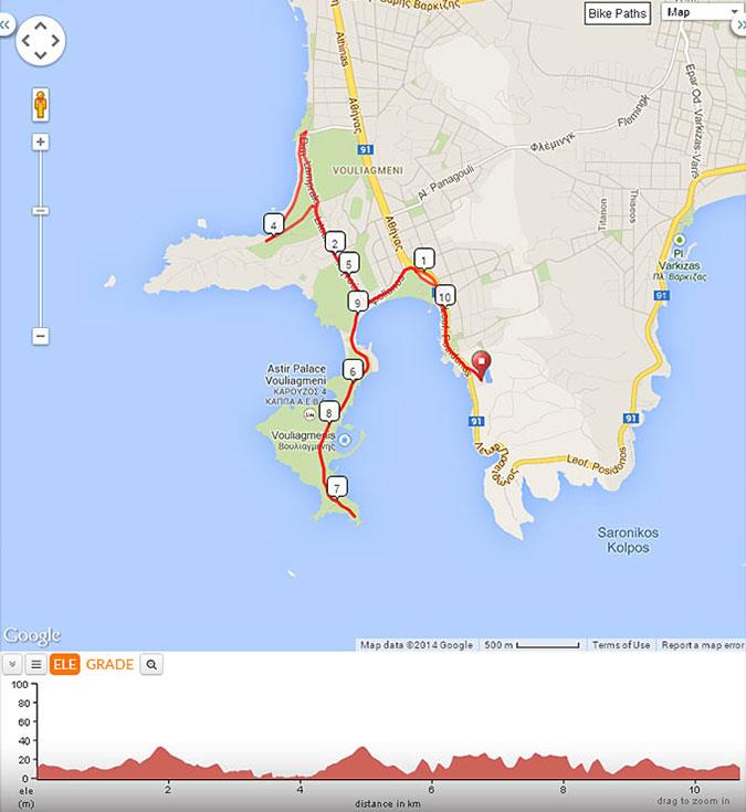 Γύρος Βουλιαγμένης 10,6 χιλιόμετρα- Μέση Η αφετηρία και ο τερματισμός γίνεται στην είσοδο της Λίμνης. Η διαδρομή ξεκινά από τη Λίμνη, πάει παράλληλα με την Ποσειδώνος με κατεύθυνση προς Αθήνα, περνά το Μεγάλο Καβούρι και τον παραλιακό πεζόδρομο, τον Αστέρα Βουλιαγμένης, συνεχίζει μέχρι τέλους στην οδό Απόλλωνος και μετά πάλι πίσω στην αφετηρία.