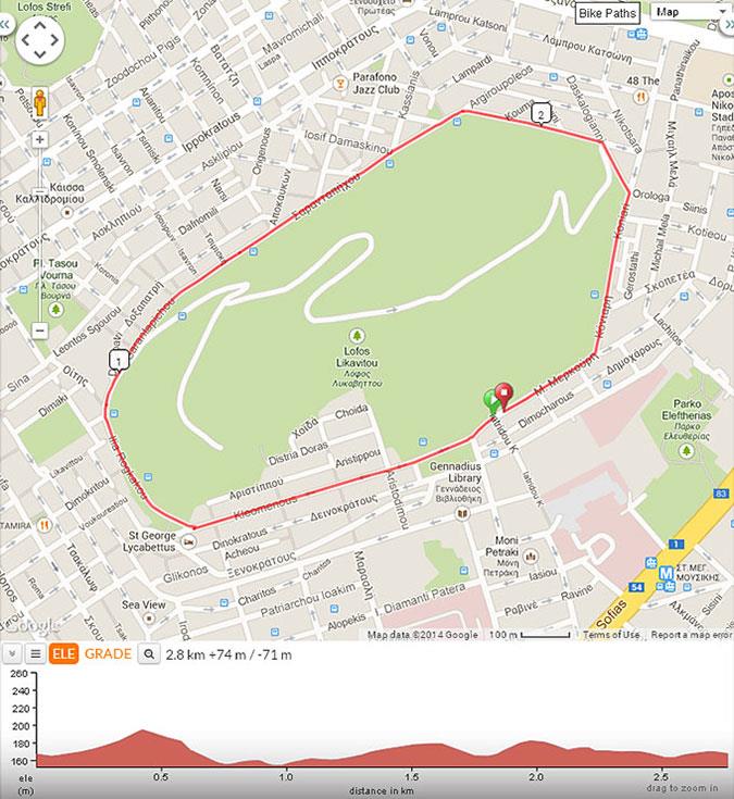 Περιφερειακός Λυκαβηττού ~ 3 χιλιόμετρα – Δύσκολη Ιδανική διαδρομή αν θέλετε να κάνετε προετοιμασία για φυσική κατάσταση εν όψει μαραθωνίου ή ημιμαραθωνίου λόγω της κλίσης της, η οποία σε πολλά σημεία υπερβαίνει το 20%. Η καλύτερη ώρα είναι αργά το βράδυ ή καθημερινές νωρίς το πρωί για να αποφύγετε τα αυτοκίνητα. Bonus για… τολμηρούς η ανηφόρα του λόφου. Δείτε την διαδρομή εδώ.