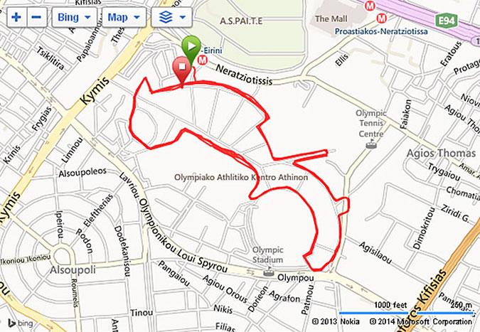 ΟΑΚΑ Από 1 χιλιόμετρο – Εύκολη Κυκλική διαδρομή στο Ολυμπιακό Στάδιο με λίγα σκαλάκια, λίγη ανηφόρα και αρκετά επίπεδα σημεία η οποία είναι περίπου ένα χιλιόμετρο, αλλά φυσικά μπορείτε να την κάνετε όσες φορές θέλετε (και αντέχετε). Σε περίπτωση που θέλετε να κάνετε διαλειμματικό τρέξιμο η διαδρομή στο πλακόστρωτο με τις μεταλλικές αψίδες είναι περίπου 500 μέτρα. Δείτε τον χάρτη εδώ.