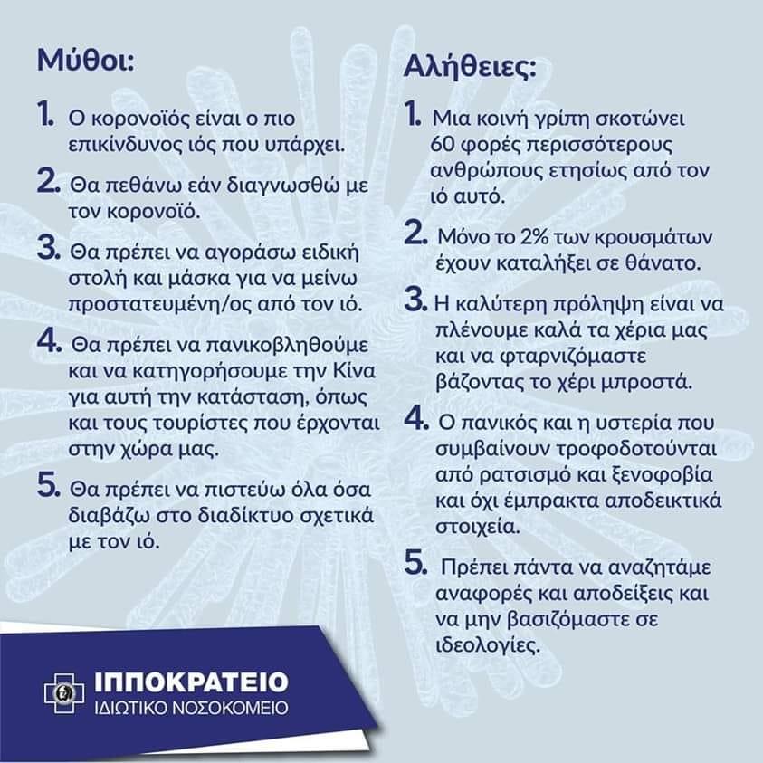 Παιδιά, ψυχραιμία. Ο κορονοϊός είναι εδώ, αλλά δεν είναι τόσο επικίνδυνος όσο τον κάνουν να μοιάζει οι προσπάθειες διασποράς του πανικού. Η κοινή γρίπη σκοτώνει 60 φορές περισσότερους ανθρώπους από τον κορονοϊό, από τα κρούσματα του οποίου ένα 2% ήταν τελικά θανατηφόρα.