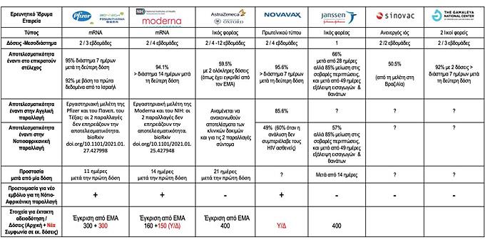 Ο κ. Μόσιαλος παρουσίασε παράλληλα έναν πίνακα με απλή συγκριτική μελέτη των επτά εμβολίων και κάποια στοιχεία για την αποτελεσματικότητα στο επικρατούν στέλεχος και τις δύο σημαντικές παραλλαγές.