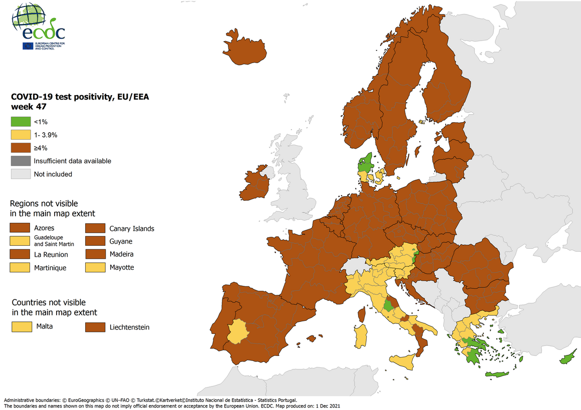 Στο «βαθύ κόκκινο» βρίσκεται η επιδημιολογική εικόνα της Ελλάδας σύμφωνα με τον χάρτη που κοινοποίησε νωρίτερα σήμερα το Ευρωπαϊκό Κέντρο Ελέγχου και Πρόληψης Νοσημάτων (ECDC).