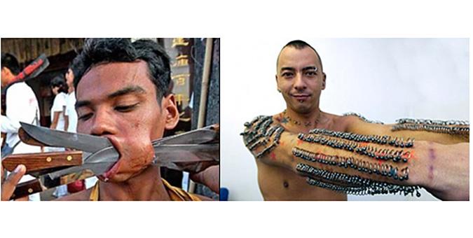 Υπάρχουν όμως περιπτώσεις όπου ένας πολύ σοβαρός τραυματισμός δεν προκάλεσε τόσο μεγάλης έντασης πόνο όσο θα περιμέναμε με βάση τη βαρύτητα του τραυματισμού, αλλά και το συναισθηματικό αντίκτυπό του, όπως φαίνεται στις παρακάτω φωτογραφίες. Βλέπουμε λοιπόν, ότι μπορεί να υπάρχει ένας βαρύς και εκτεταμένος τραυματισμός ο οποίος να μην προκαλεί τον πόνο που θα περιμέναμε. Γεννάται έτσι μια εύλογη απορία : Πώς γίνεται να έχουμε ένα τόσο σοβαρό τραυματισμό που μόνο που τον βλέπουμε «πονάμε» εμείς οι ίδιοι, ενώ ο παθών δε δείχνει σοβαρά σημάδια πόνου στο πρόσωπό του; Πόσοι από εμάς έχουμε κόψει το χέρι μας μια σελίδα χαρτιού; Ο πόνος είναι χαρακτηριστικά έντονος. Πώς γίνεται λοιπόν ένας βαρύς τραυματισμός να πονάει λιγότερο από ένα επιπόλαιο μια σημαντικά μικρής έκτασης τραύμα;