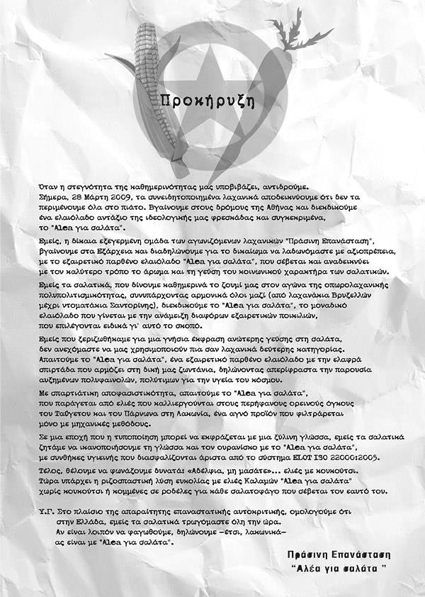 Το «λάδωμα» δεν είναι προνόμιο των ανθρώπων, λένε τα… λαχανικά. Το λάδι Alea για σαλάτα και ορισμένοι από τους επιφανέστερους εκπροσώπους της υγιεινής διατροφής και της… εξωκοινοβουλευτικής λαχαναγοράς σας καλούν σε μια πραγματικά πρωτότυπη διαδήλωση.