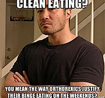 «Η εμπειρία στη πράξη επίσης μας έχει δείξει πως οι άνθρωποι που ακολουθούν διατροφές με υπερβολικές απαγορεύσεις και περιορισμούς συνήθως δεν μπορούν να είναι συνεπείς σε κάτι τέτοιο παραπάνω από μερικές μέρες», τονίζει σχετικά. Σε αυτές τις περιπτώσεις, η καθαρή διατροφή μπορεί να γυρίσει «μπούμερανγκ», και να πάει στο άλλο άκρο, με αποτέλεσμα να εμφανιστούν διατροφικά ξεσπάσματα, γνωστά ως «cheat meals», ή «ελεύθερα γεύματα». «Τα ξεσπάσματα αυτά μπορούν να αποκτήσουν παθολογικό χαρακτήρα, όπου εκεί πλέον δεν μιλάμε για λίγες θερμίδες παραπάνω αλλά για αδηφαγικό επεισόδιο. Τέτοιες διατροφικές συνήθειες είναι πολύ συνηθισμένες στο αγωνιστικό bodybuilding, και μάλιστα θεωρούνται απολύτως αποδεκτές», προσθέτει.