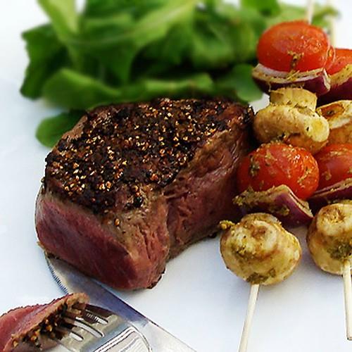Υλικά: 2 φιλέτα μοσχαρίσια (περίπου 125 γρ. έκαστο), 2 κουτ. σούπας μαύρο πιπέρι ολόκληρο, 1 κουτ. σούπας θαλασσινό χοντρό αλάτι, 4 κουτ. σούπας ελαιόλαδο, 1 μεγάλο ξερό κρεμμύδι, 16 φρέσκα ντοματάκια cherry (μικρά), μερικά φρέσκα μανιτάρια